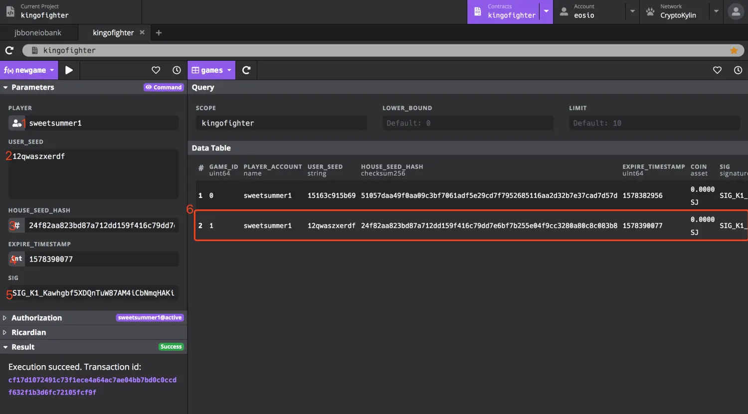 从1-6分别是,1:玩家EOS账号地址;2:用户的随机种子;3:服务端种子哈希值;4:本次签名过期时间;5:服务端签名数据;6:执行后保存在games表的数据,此时数据的status应该为1,因为我们后端服务有轮询处理,过一会就会变成2,表示已处理: