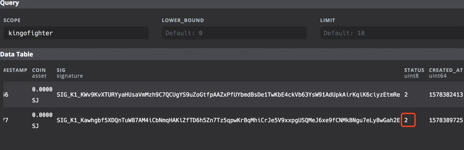 EOS.index_table(table='games', lower_bound=1, limit=100, index_position=3)实现查询需要处理的数据,还记得上面我们games表status字段值有1和2两个值分别代表未处理和已处理。这里lower_bound=1就是查询未处理。limit即查询条数。index_position 是索引的位置,为什么是3?我们看看前面索引是怎么声明的: