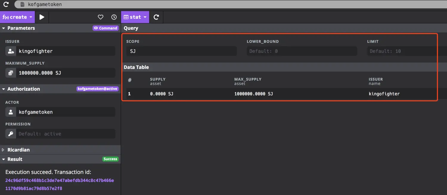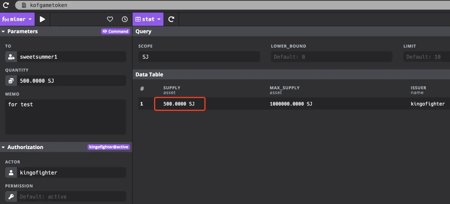 上面注意需要使用小游戏的智能合约的账号权限来调用,执行成功后,可以看到右边stat表的发行量数据变为500了。我们可以查看玩家这时候的 SJ余额: