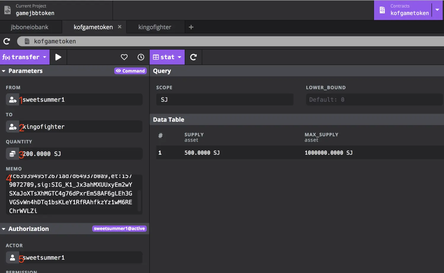 现在,代码都已经编写完毕,但在开始对战之前,如果想要氪金,玩家还需要有SJ,但目前玩家并没有任何SJ代币,我们可以赠送一些给他用于内部测试,打开EOS studio,切换到Token智能合约界面,选择miner,决定赠送500个SJ给玩家:
