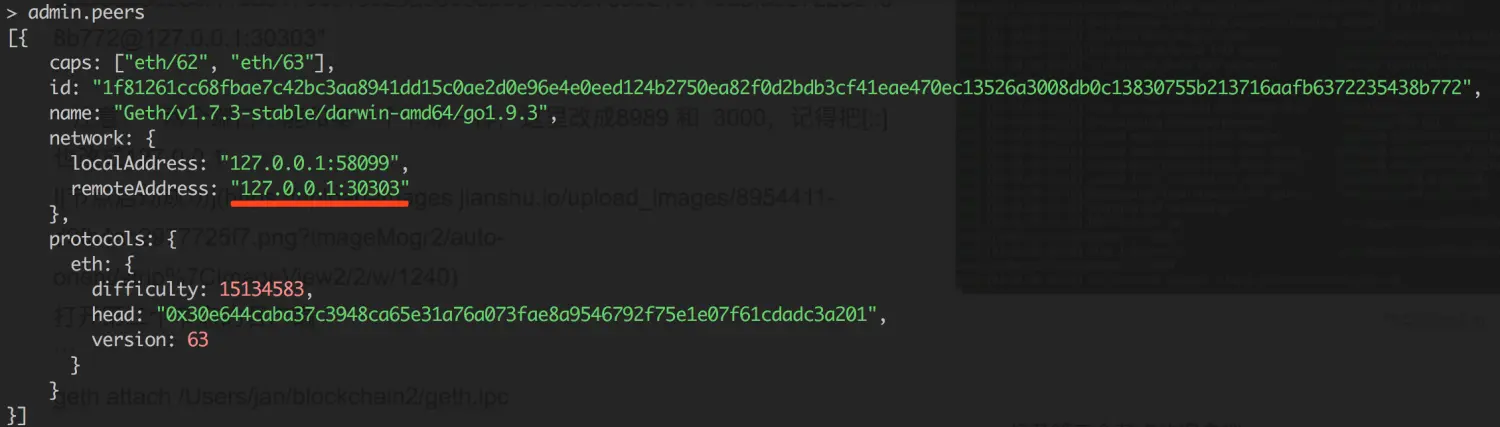 geth --networkid 15 --datadir /Users/jan/blockchain2 --rpcport 8989 --port 3000 --bootnodes "enode://1f81261cc68fbae7c42bc3aa8941dd15c0ae2d0e96e4e0eed124b2750ea82f0d2bdb3cf41eae470ec13526a3008db0c13830755b213716aafb6372235438b772@127.0.0.1:30303"注意: 两个端口不能和第一个节点一样,这里改成8989 和 3000,记得把[::]也改成127.0.0.1