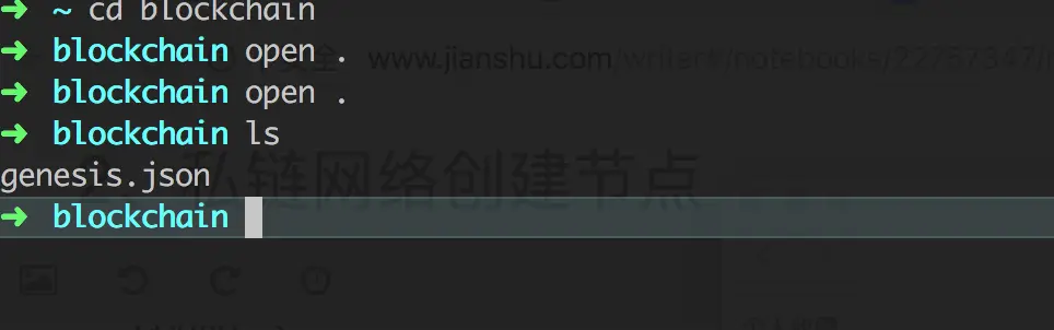 cd blockchain进入目录,把上面代码拷贝好,新建文件genesis.json: