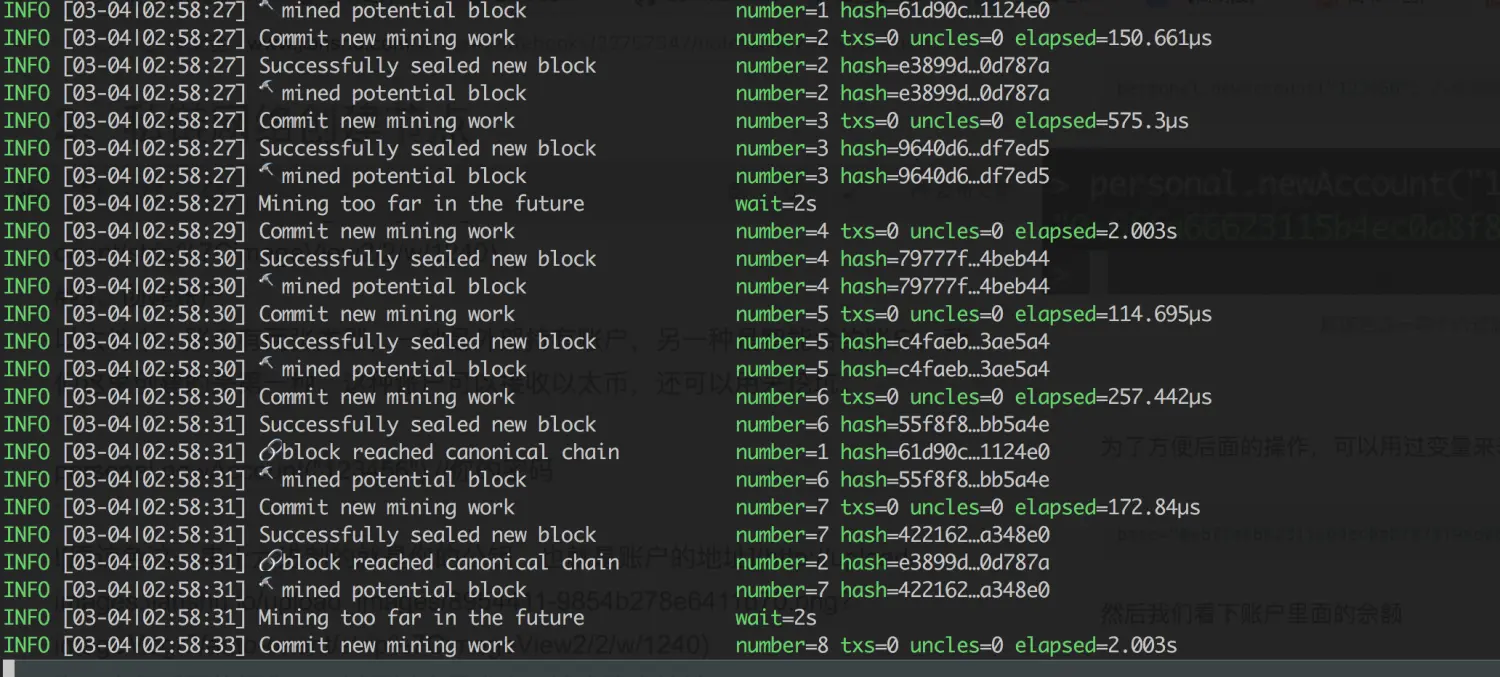 切换到第一个终端,发行出现了一坨新区块不断生成的信息,再切回到控制台输入查看余额