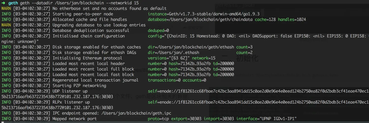 命令中networkid:1表示主网,2(disused)、3、4都是测试网络,其他就是私链网络 启动后,目录会多出geth.ipc文件 接着,我们新开一个终端,用来当作连接到节点的控制台