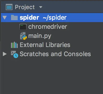 新建项目 打开PyCharm新建一个项目,就命名为spider吧,再新建一个main.py文件。 将第3步下载好的chromeDriver解压到项目根目录下,现在整个项目就是这样: