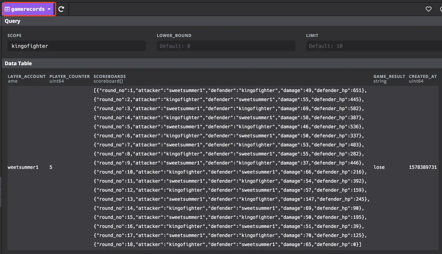 到这里整个流程已经走完。正常情况是应该使用HTML提供给玩家调用,然后展示对战过程和对战结果,我为了方便就直接使用EOS studio来代替了。从上图可以看出,对战的结果是玩家输了,这个游戏可能是太难了,不过没关系,还记得我们对战胜利会获得的水晶(SJ)吗?其实这里水晶会被设计成一种代币(TOKEN),下一章我们加入TOKEN体系来实现"氪金"的功能。