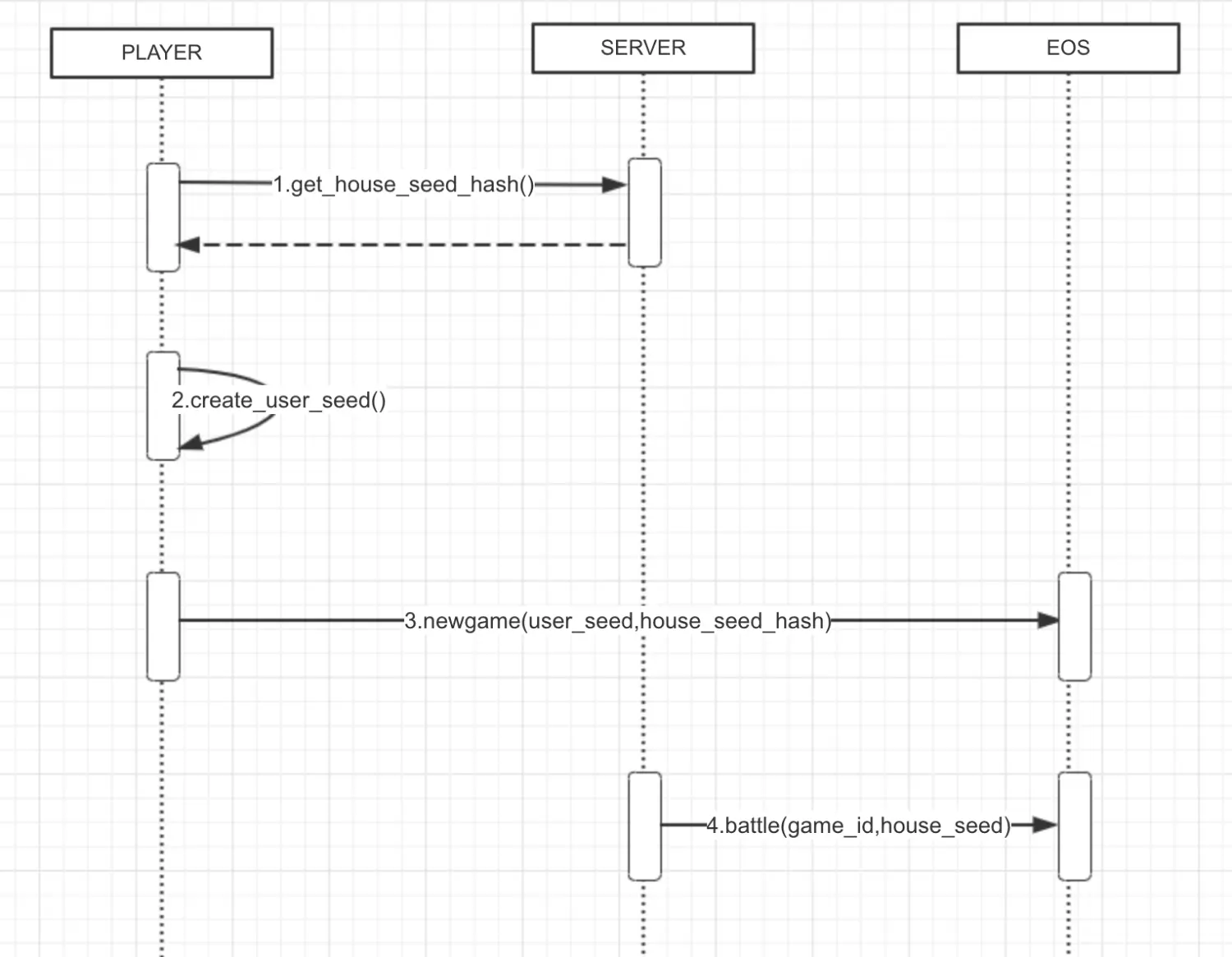 其实提交者不一定需要知道另一方的种子的值是什么,只要保证另一方在开奖前就给出了种子,并且确保给出的种子和实际智能合约使用的是同一个,就可以保证另一方没有作弊。而哈希算法正好能解决我们的问题,下面给出我们设想的一种调用流程图: