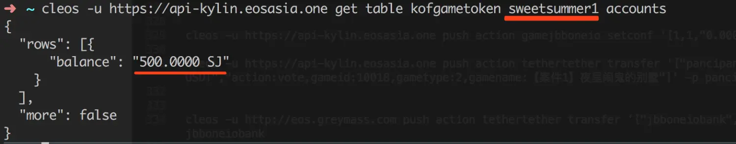 上面注意需要使用小游戏的智能合约的账号权限来调用,执行成功后,可以看到右边stat表的发行量数据变为500了。我们可以查看玩家这时候的 SJ余额: