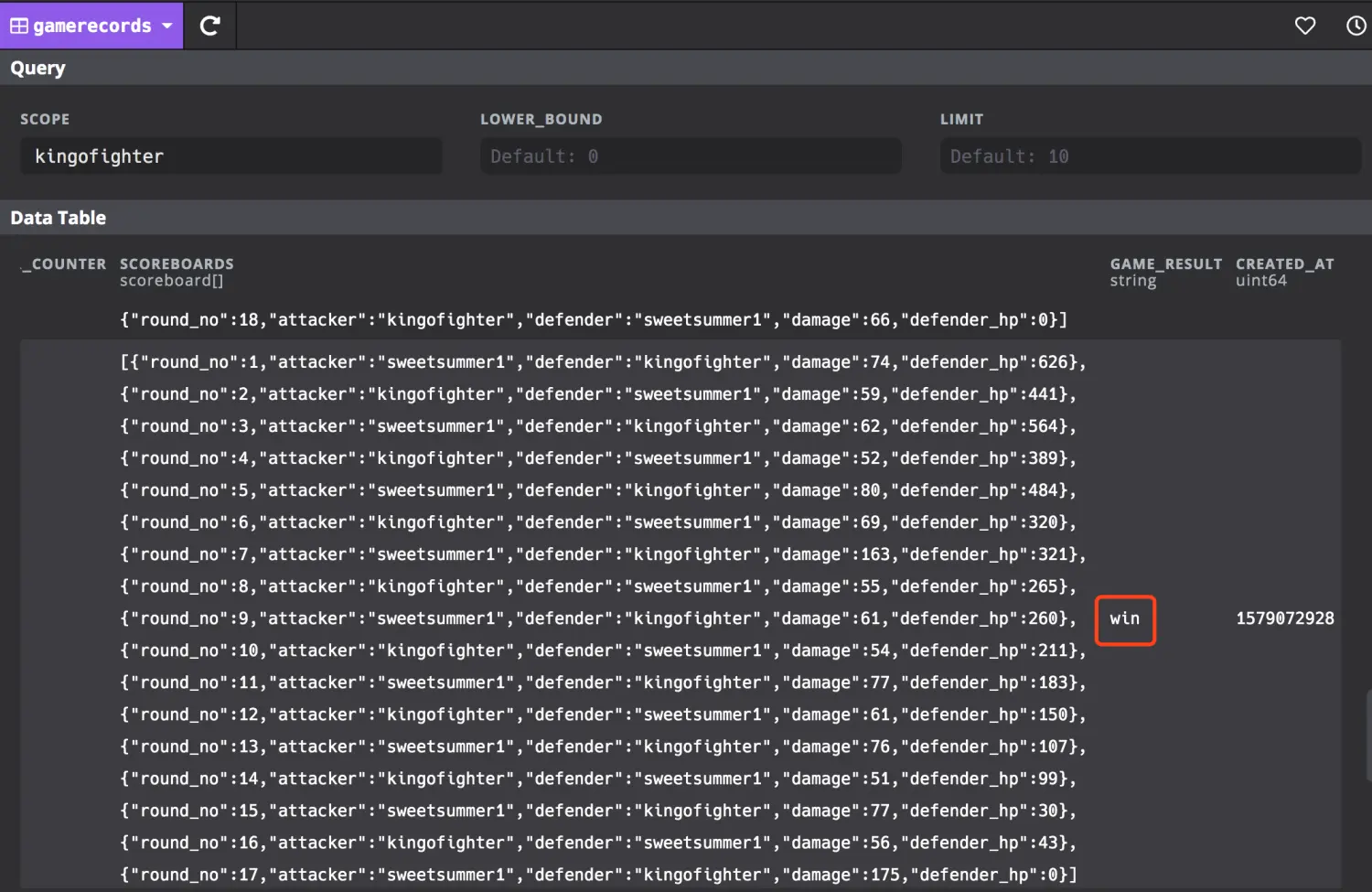 action:imrich,us:9a114079014a,ush:6e64e182e42920b689368ebc732188dbe7ac7c63939495f2671ad7d64937b0a9,et:1579072709,sig:SIG_K1_Jx3ahMXUUxyEm2wYSXaJoXTsXhMGTC4g76dPxrEm58AF6gLEh3GVGSvWn4hDTq1bsKLeY1RfRAhfkzYz1wM6REChrWVLZi点击执行后,等一会服务端自动调用对战后,再看看gamerecords表的对战结果,显示胜利。仔细查看每一次对BOSS造成的伤害明显增加了不少: