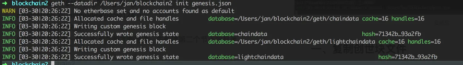 mkdir blockchain2然后将第一个节点的genesis.json文件拷贝到 /blockchain2目录下 初始化区块