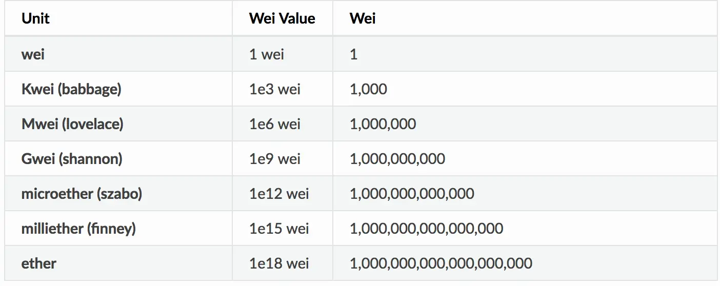 1000000000000000000通过挖坑后,发现two的余额增加了,当然每一笔交易是需要手续费的,手续费由交易发起人付(也就是one)。你可能会问怎么余额数值这么大,之前说过这里的单位是wei,1e18wei才等于1个以太币。除了wei,以太坊还有其他几种单位:
