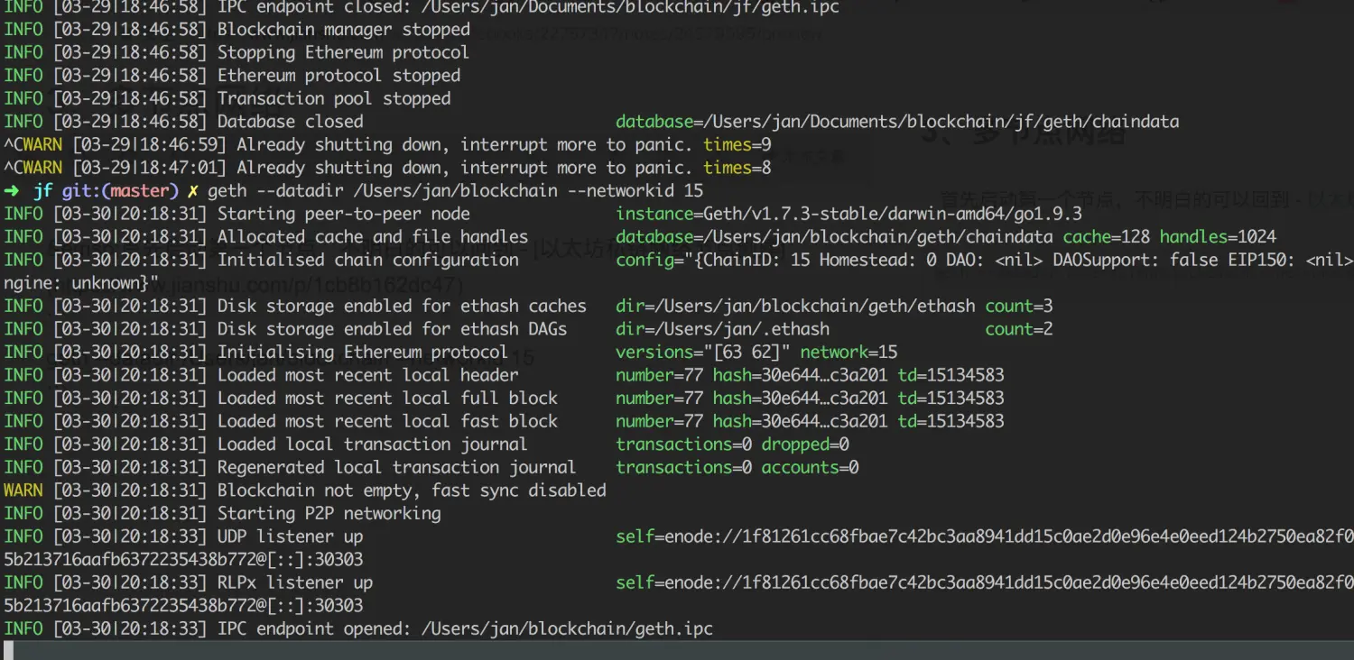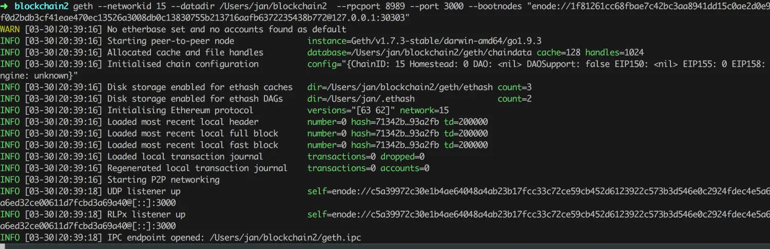 geth --networkid 15 --datadir /Users/jan/blockchain2 --rpcport 8989 --port 3000 --bootnodes "enode://1f81261cc68fbae7c42bc3aa8941dd15c0ae2d0e96e4e0eed124b2750ea82f0d2bdb3cf41eae470ec13526a3008db0c13830755b213716aafb6372235438b772@127.0.0.1:30303"注意: 两个端口不能和第一个节点一样,这里改成8989 和 3000,记得把[::]也改成127.0.0.1