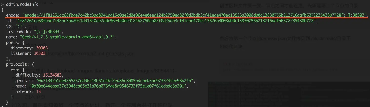 其中enode项就是节点的地址,[::]表示本机,30303表示端口,有了节点地址就可以加入了,再新开一个控制台,使用第一个节点的地址来启动第二个节点
