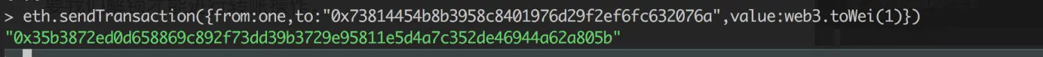 输出一行十六进制字符串,这个是交易的哈希码,这个交易哈希非常重要,后面文章会介绍,现在只需要知道每一个交易都会有对应的交易哈希就行。