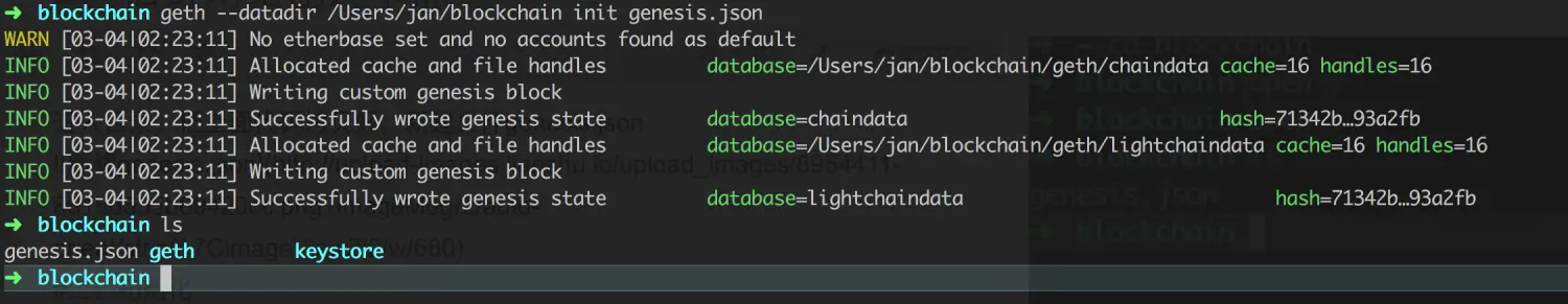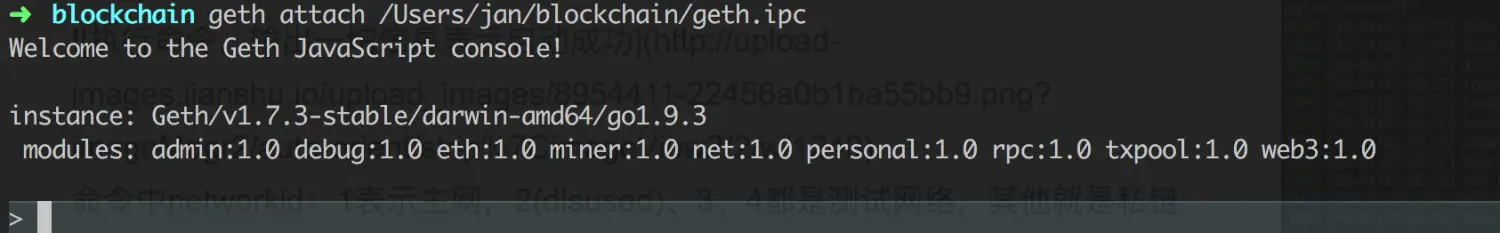命令中networkid:1表示主网,2(disused)、3、4都是测试网络,其他就是私链网络 启动后,目录会多出geth.ipc文件 接着,我们新开一个终端,用来当作连接到节点的控制台