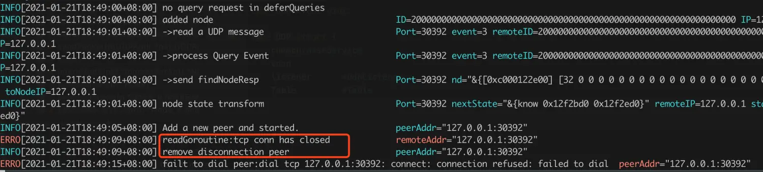 上图依然是节点1的日志输出,这次我们把节点2关闭了,这时候可以看到节点2的连接被移除,接着把节点2peer实例也一起移除,而在节点发现层,在刷新k桶的时候会把状态流转到unresponsive,直到节点2重新上线。